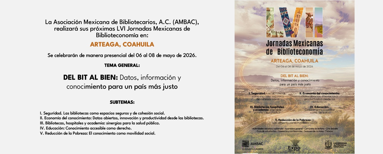 COMUNICADO DE PRENSAAMBAC convoca a las LVII Jornadas Mexicanas de Biblioteconomía 2026Del Bit al Bien: datos, información y conocimiento para un país más justo La Asociación Mexicana de Bibliotecarios, A.C.…