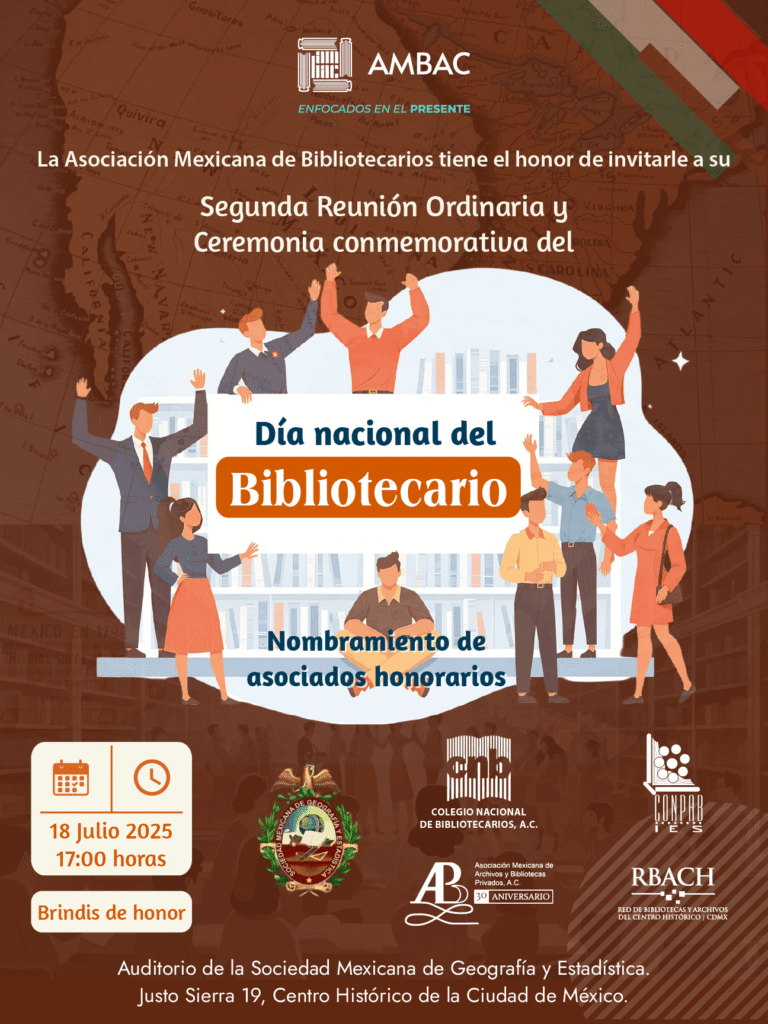 La Asociación Mexicana de Bibliotecarios tiene el honor de invitarle a su Segunda reunión ordinaria y a la ceremonia conmemorativa del “Día Nacional del Bibliotecario” 2025.